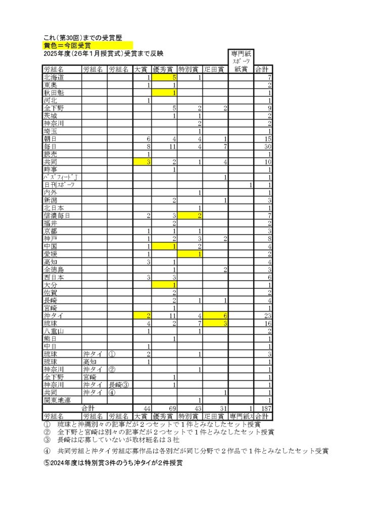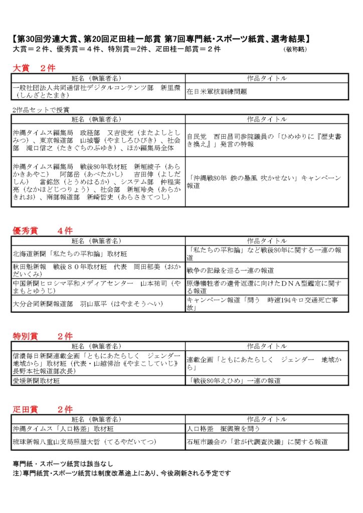 2025年度新聞労連ジャーナリズム大賞、専門紙・スポーツ紙賞、疋田桂一郎賞決定